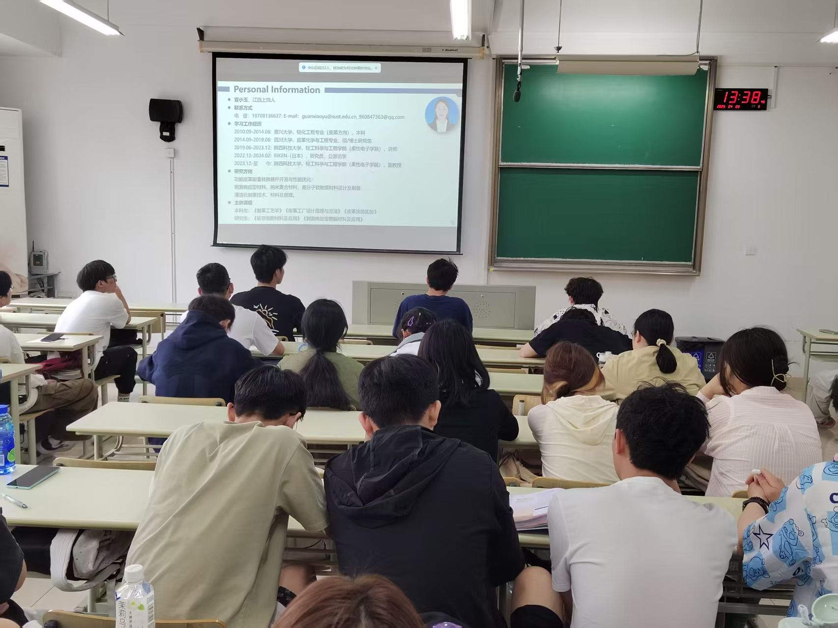 随后,她深入介绍了自己目前从事的前沿研究领域,从磁刺激响应的纳米复合微球助力制革清洁生产,到天然生物质凝胶治理制革废水实现资源化利用,再到软物质材料在柔性电子领域的创新应用,以及功能化皮革能量转换器件开发等,一项项研究成果拓宽了同学们的视野。同学们听得津津有味,对专业未来发展充满期待,纷纷表示要扎根专业,砥砺奋进。此次线上交流为轻化2024级学子点亮了专业前行的道路,助力他们开启精彩的大学篇章。