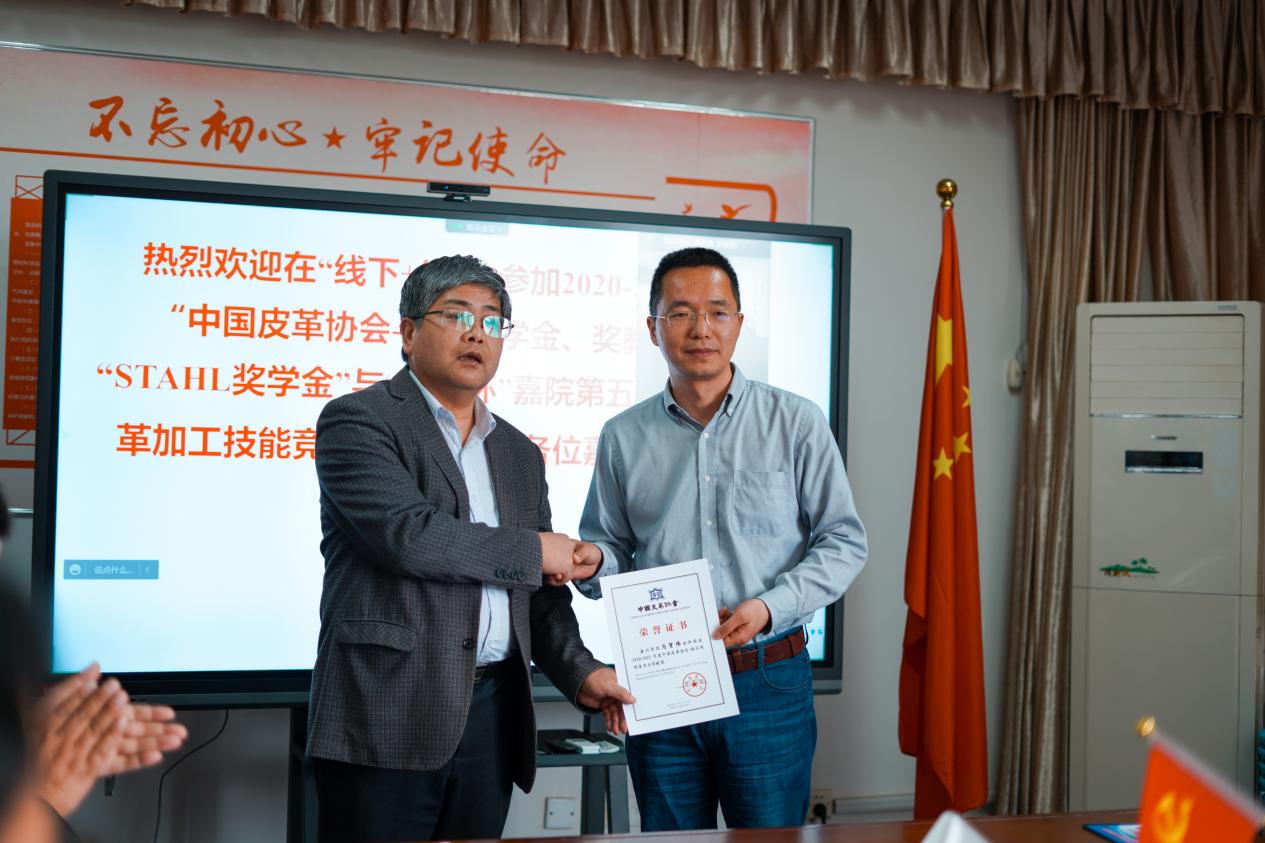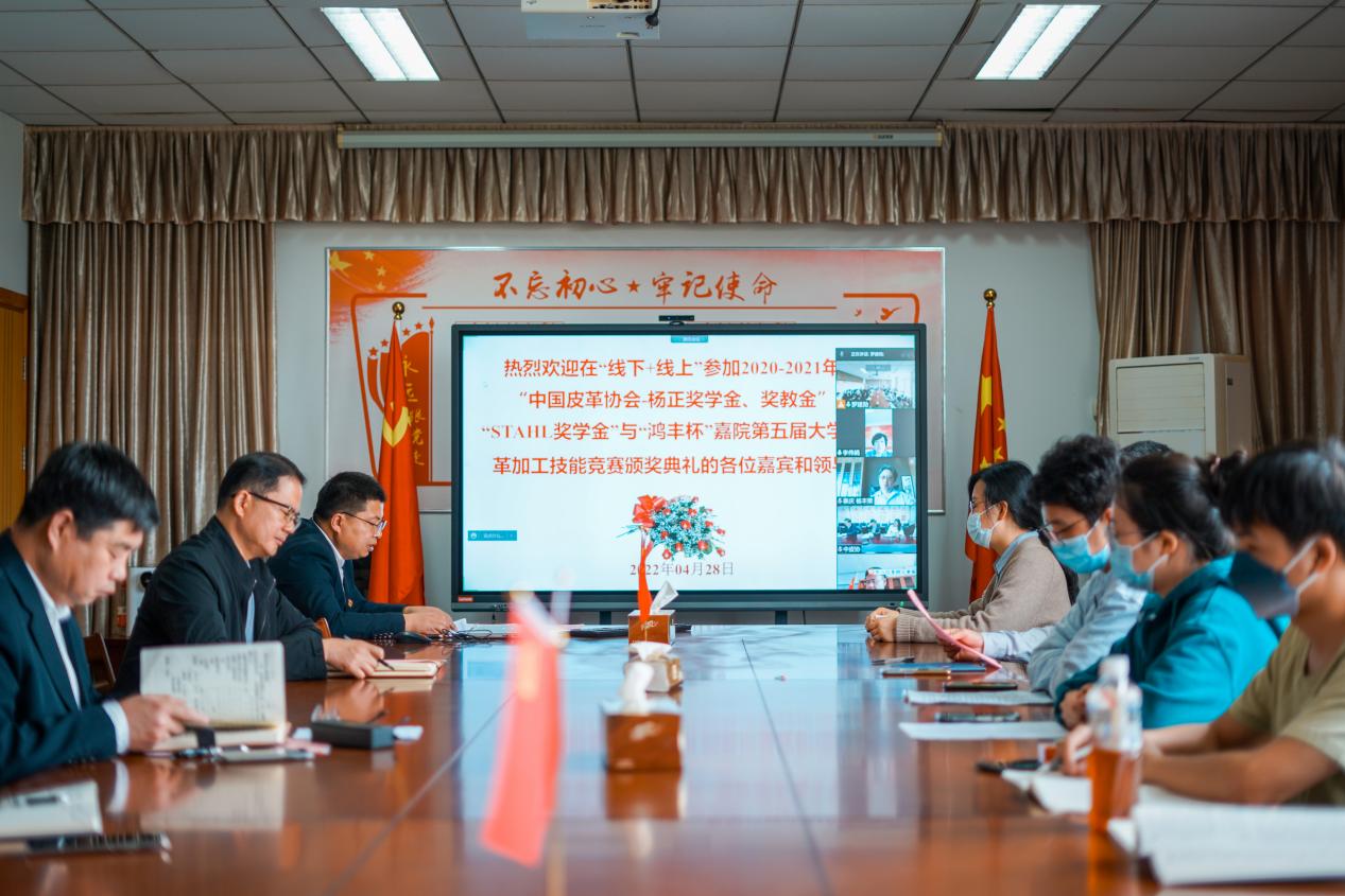4月28日下午,我院在10号楼419会议室隆重举行“中国皮革协会-杨正奖学金、奖教金”、“STAHL奖学金”和“‘鸿丰杯’嘉兴学院第五届大学生皮革加工技能竞赛”颁奖典礼。受疫情影响,此次颁奖典礼采用线上和线下相结合的方式进行,中国皮革协会副理事长陈占光,中国皮革协会秘书长张燕,中国皮革协会副理事长、浙江省皮革行业协会理事长李伟娟,中国皮革协会副理事长、福建泰庆皮革有限公司杨丰荣副董事长,斯塔尔精细化工(苏州)有限公司李艳经理、徐州鸿丰高分子材料有限公司陈治军总经理、浙江富卡科技有限公司李新建主任等嘉宾和学生家长代表线上出席此次颁奖典礼。我院院长易洪雷教授,党委书记韩宝明老师,副院长李海东教授,校教务处处长助理、轻化工程系主任罗建勋副教授及轻化工程系全体师生参加了本次颁奖典礼,典礼由罗建勋主任主持。