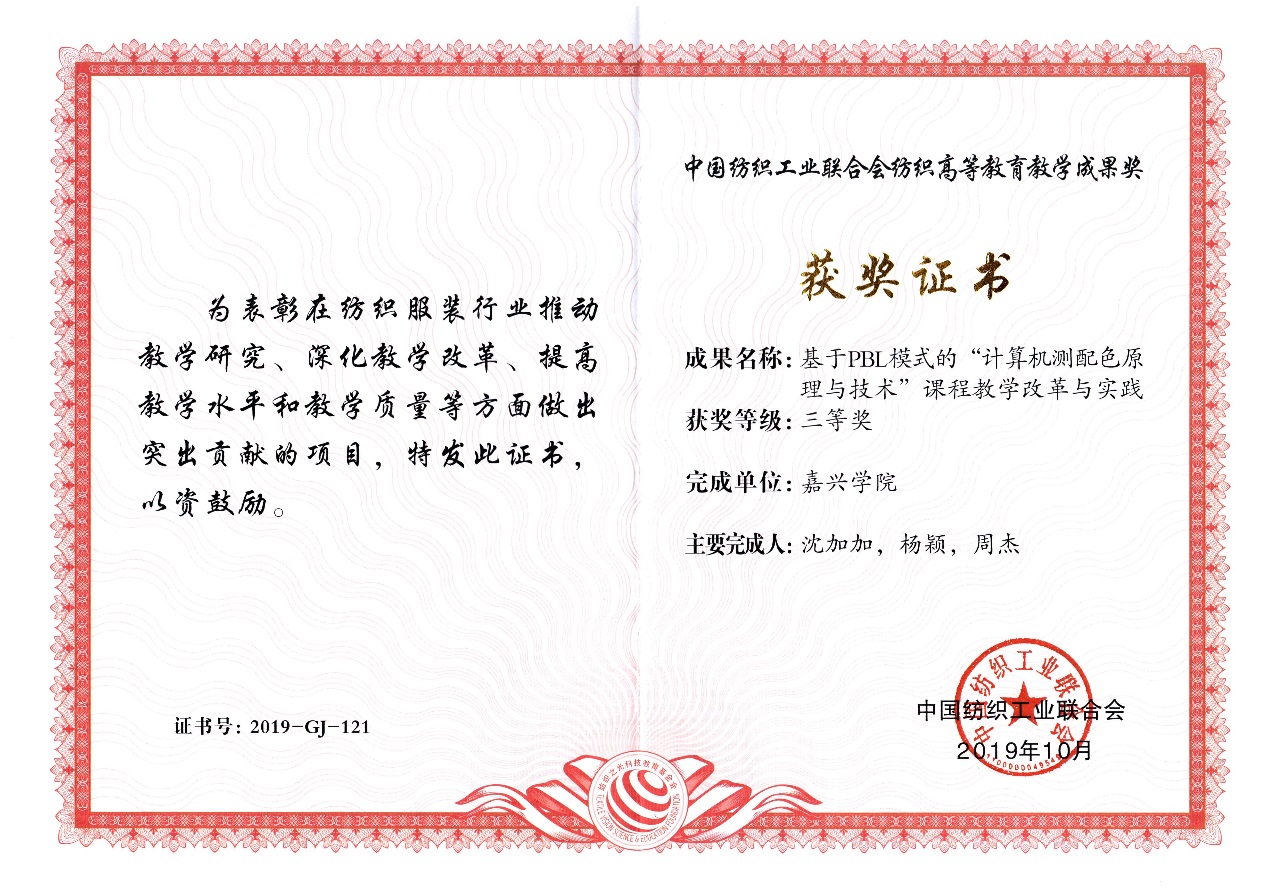 会上发布了“纺织之光” 2019年度中国纺织工业联合会高等教育教学成果奖评审结果,我院纺织工程系副主任沈加加副教授主持的《基于PBL模式的“计算机测配色原理与技术”课程教学改革与实践》教学成果荣获三等奖。