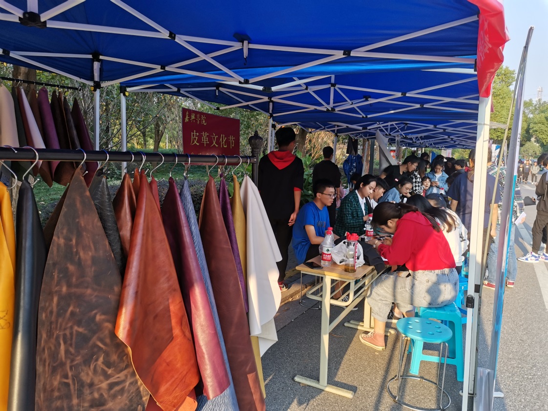 办学105周年之际,作为校庆重要活动内容之一,由我院轻化工程系主办与院团委协办的“嘉兴学院第四届皮革文化节”于10月19日在梁林校区第一食堂对面举行。本届皮革文化节由李书卿老师和轻化(实验)171班王荣娅同学联袂策划,轻化工程系全体师生、学院团委干事及梁林校区其它专业的学生参与了该项活动。另外,我院院长易洪雷教授莅临皮革文化节现场并给予指导。