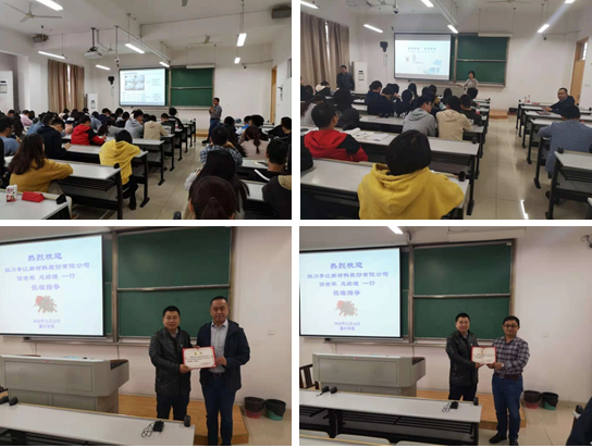 2018年11月13日,四川亭江新材料股份有限公司总经理任世军、技术研发部经理李靖博士、人力资源部胡经理一行来麻豆影院 轻化工程专业招聘及交流。首先罗建勋主任代表轻化工程专业向任世军总经理、李靖博士颁发校外兼职教师聘书;随后,李靖博士为轻化工程专业全体师生做了主题为“无铬鞣研究最新进展——从研发到应用”的精彩报告,报告内容反映了数年来公司在新型无铬鞣剂研发方面的巨大投入及研发人员的辛勤付出;胡经理围绕公司的发展历程、薪资福利及人才培养需求等方面进行了细致讲解,会后及时了解了学生对工作的期望,并对轻化工程专业的部分学生进行了面试。