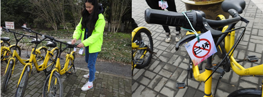 3月8日下午13:30,志愿者们组成五只小分队,在不影响同学们正常用车的情况下,对教学楼以及校门口等共享单车较为密集的区域进行了车辆整理和报修工作。遵循着“不漏过一辆坏车”这个原则,志愿者们利用手机共享单车APP,逐一排查所有车辆,通过扫一扫,骑一骑,筛选出损坏单车,并在网络报修后,在车辆显眼处悬挂“已坏”标志,同时将有隐患的单车集中单独摆放,以便同学们辨别与使用。在志愿者们的辛勤工作下,共整理共享单车151辆,改善单车乱堆乱放,美化校园的同时,更是从实际出发,贴近生活,为同学们用车提供便利,节省时间。