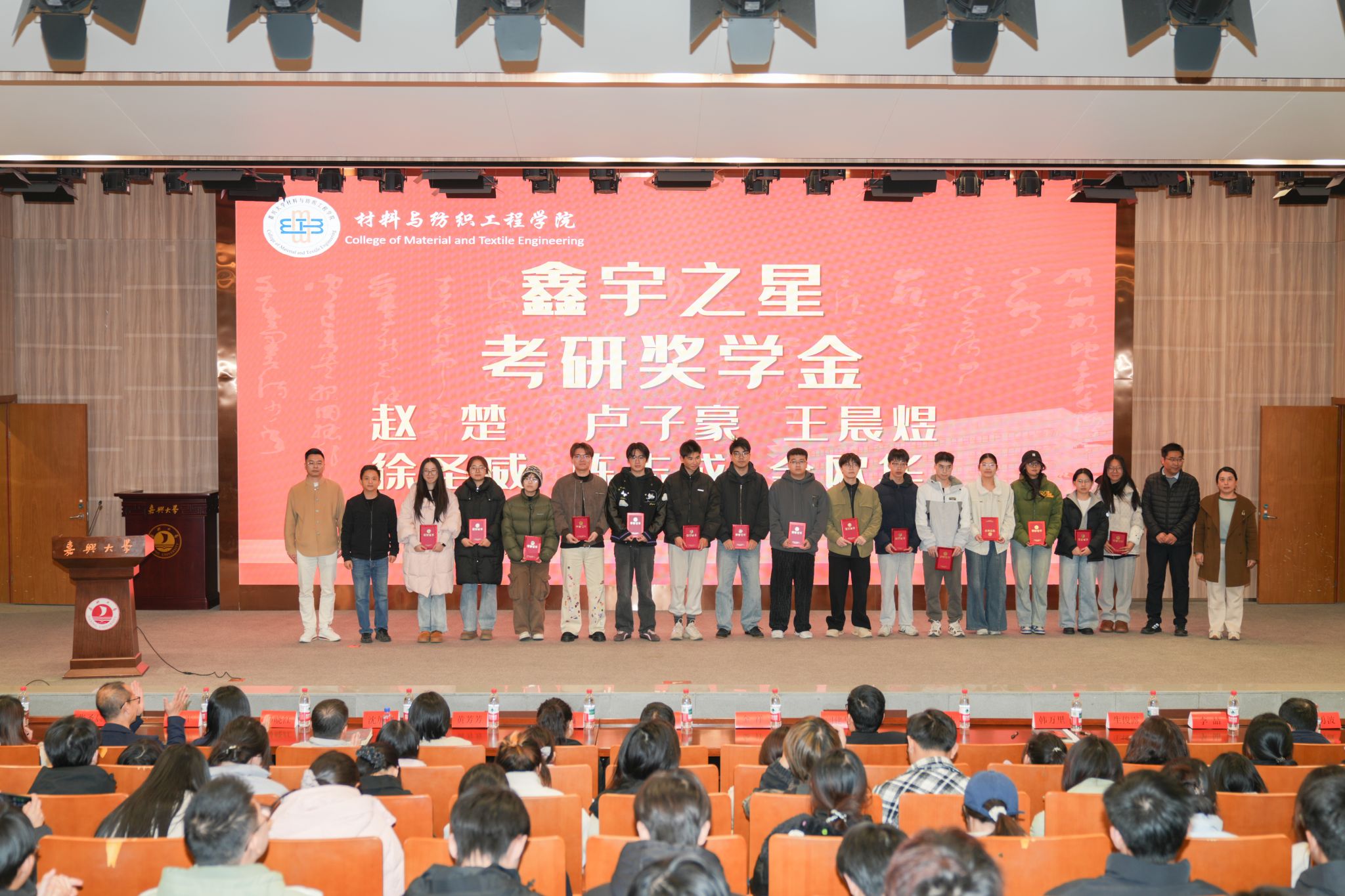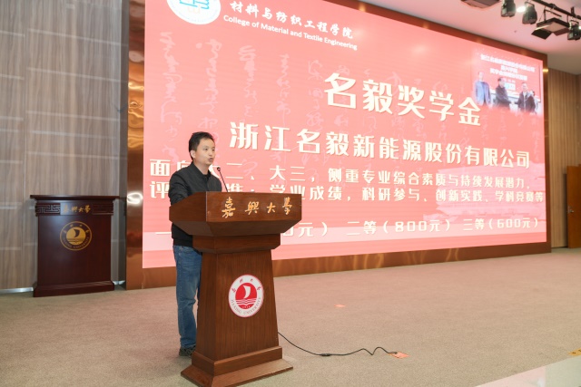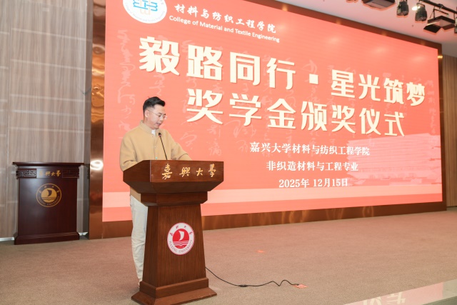 2025年12月15日,非织造材料与工程专业“名毅奖学金”和“鑫宇奖学金”颁奖典礼在图书馆报告厅隆重举行。本次典礼以“毅路同行,星光筑梦”为主题,表彰了60名品学兼优的在校学生。浙江名毅能源股份有限公司总经理徐井、副经理张燕、嘉兴市鑫宇农产品科技有限公司总经理金祥、学院党政班子及非织系专业教师代表、200余名非织学生共同见证了这一荣誉时刻。
