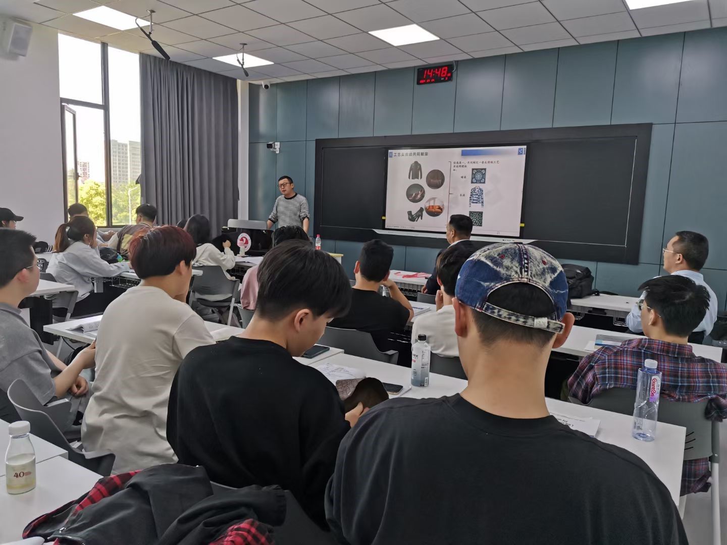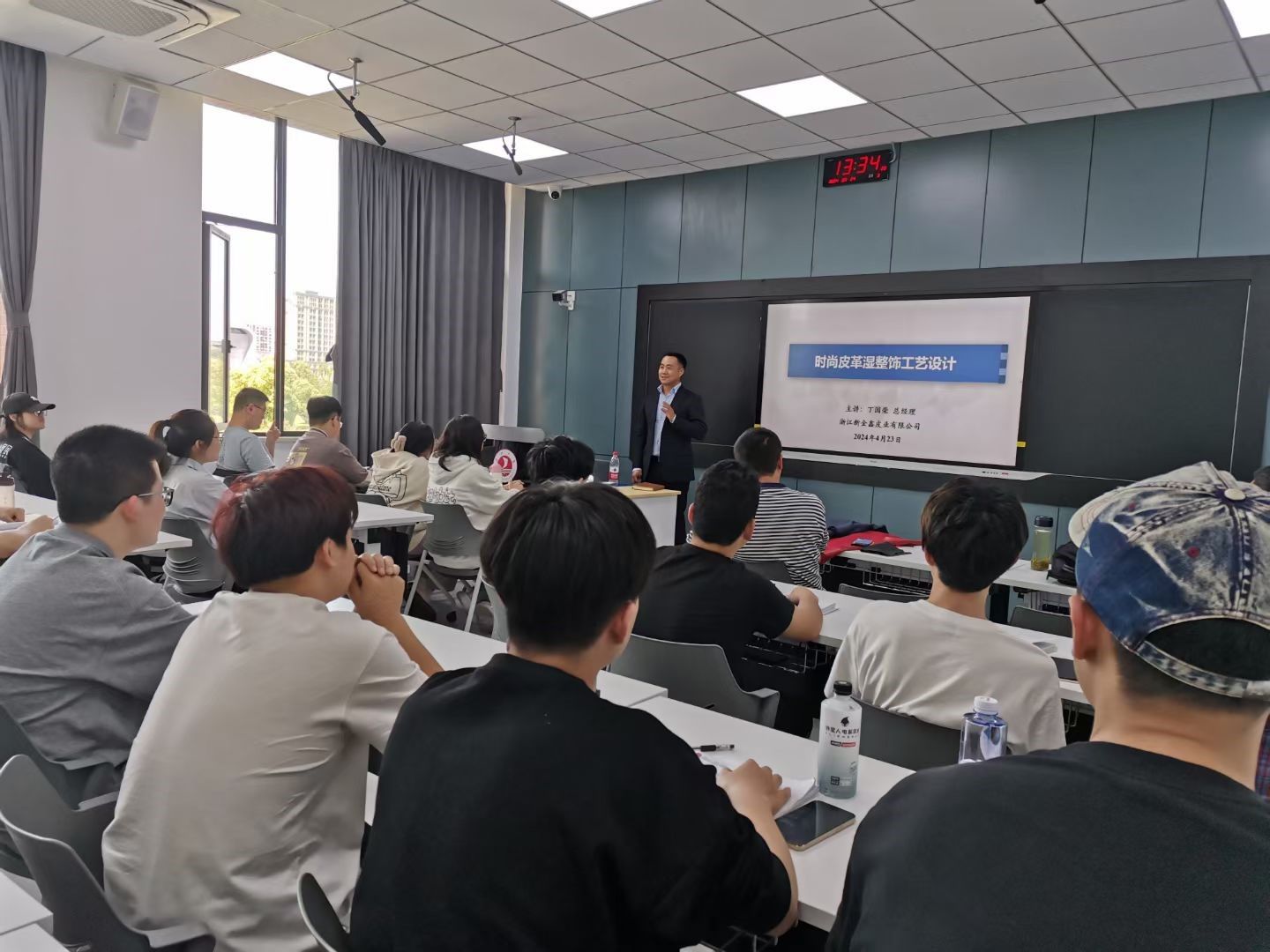 首先,丁国荣总经理和徐志毅总经理就产业课程之《皮革整饰化学及工艺学》的授课内容、讲授方式、重点、难点及达成度情况等进行了研讨。其次,丁国荣总经理以“时尚皮革湿整饰工艺设计”为题给学生们做报告,讲述了近30年来皮革湿整饰工艺的变迁、当前市场流行风格,并就多种流行风格之皮革面料湿整饰工艺设计的关键点进行了讲解。随后,两位总经理参观了轻化工程智慧实验室(产教融合校内基地),了解了我院轻化工程系的最新进展及取得的成绩,并就下一步的人才培养、科学研究等专业内涵建设进行了深入的交流。