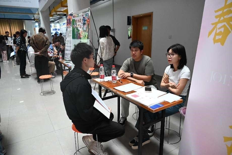 招聘会现场,招聘单位通过面对面交流、播放宣传片、展板等多种方式向参会同学介绍公司的概况、麻豆影院-麻豆影院官方最新在线看、职业规划、人员需求以及福利待遇,其中新凤鸣集团股份有限公司在现场开展宣讲会。