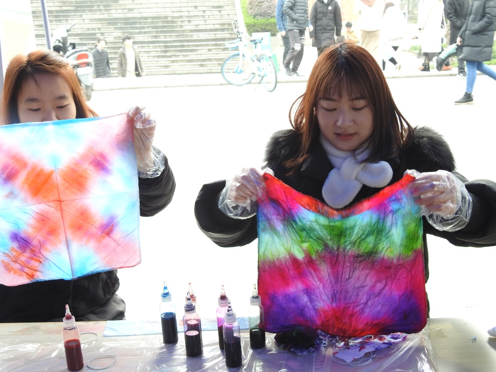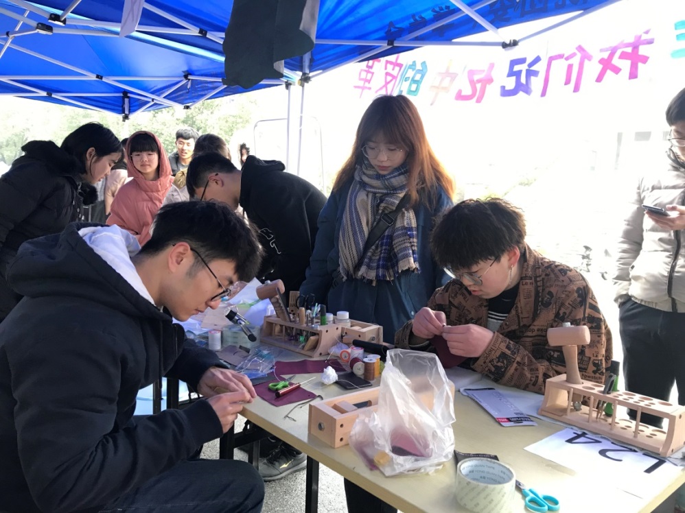 3月3日,沐浴着久违的阳光,志愿者们一早便在梁林老食堂前集合。围绕皮革面料展示,皮件清洁护理、皮具手工制作以及扎染小课堂等开展活动。过往的同学都被别出心裁的宣传版面和别致的画幅吸引,纷纷驻足向志愿者们咨询学习,志愿者们向同学们介绍了皮革的分类、真假皮制品的鉴别及日常皮具的清洁护理知识,随后,在志愿者的指导下,体验了手工皮具制作和手工扎染,在活动中亲近和了解材料专业。