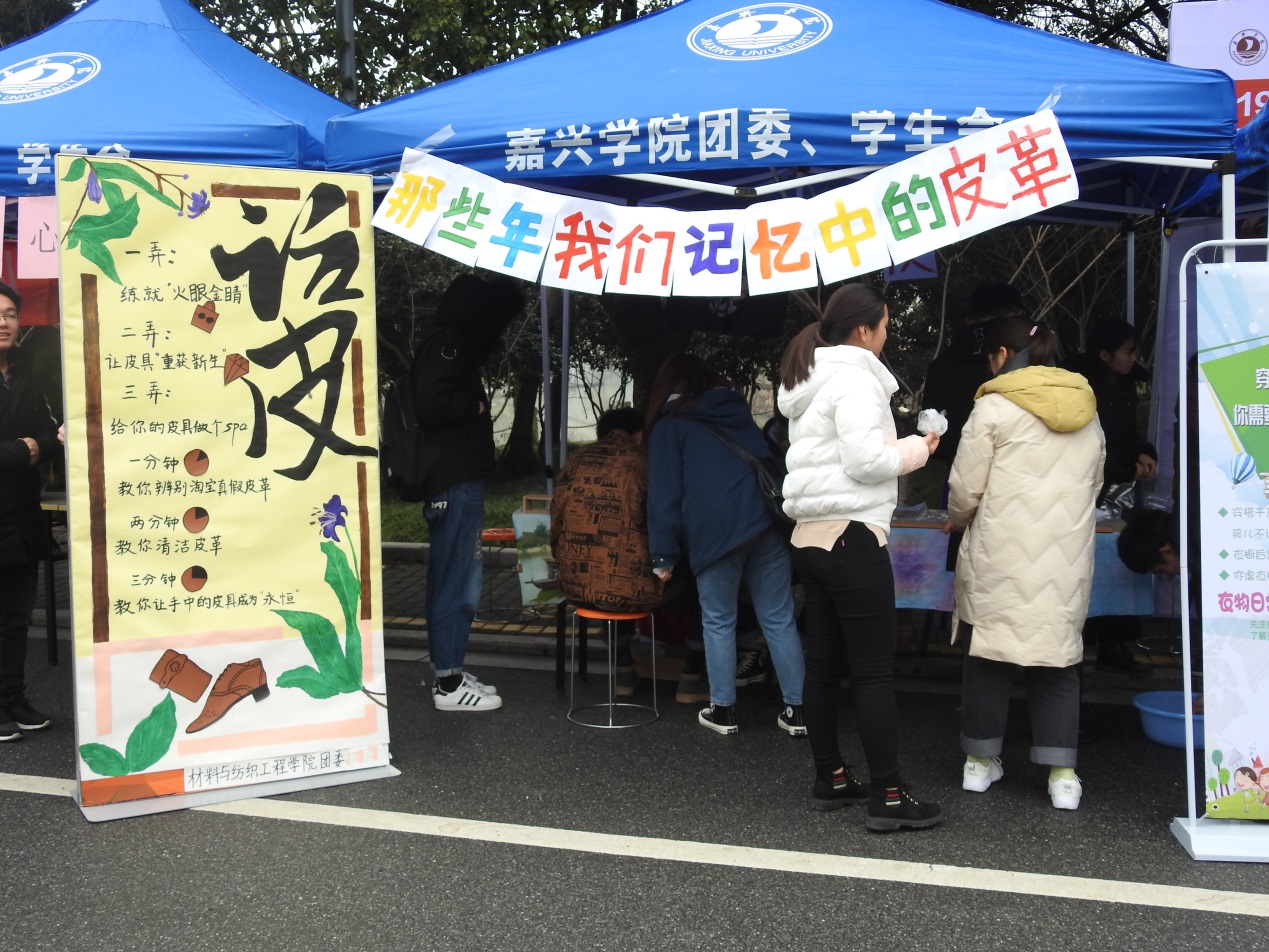 团委组织轻化“UP”皮匠社团(试运行)携手学院青年志愿者协会在梁林校区老食堂门口举行了“话皮——那些年我们记忆中的皮革”和“穿在身上的安全”主题志愿服务。