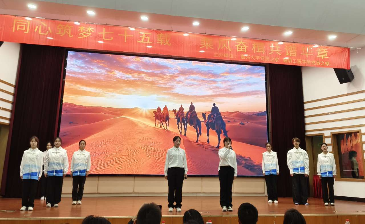 本次赛事启动以来,材纺学院积极组织学生党员报名参赛,并带领团队围绕大赛主题深入研讨、构思宣讲内容。在比赛现场,我院表演的原创节目《红帆启航,织梦未来》从纺织专业出发,结合古代丝绸之路历史和现代丝绸之路的发展,展示了新中国成立后的经济腾飞与社会繁荣,引发了彼此强烈的爱国主义情怀。