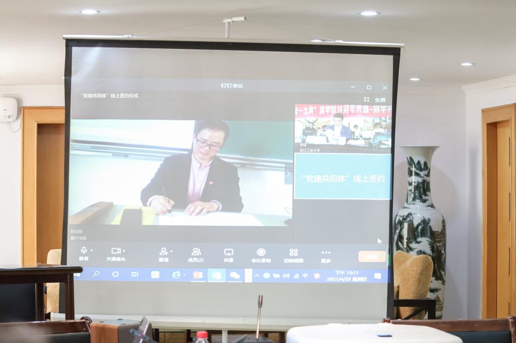 嘉兴学院材纺学院党委书记韩宝明和浙工大材料学院党委书记陈耀代表双方学院院在”党建共同体”协议书上签字,双方将以党建共同体建设为新起点,深入开展“党史联学、党务联建、科研联攻、活动联办、榜样联动、品牌联创”等工作,共同促进双方党史学习教育走心、走深、走实,协同破解高校二级学院党建工作中的难点和问题。