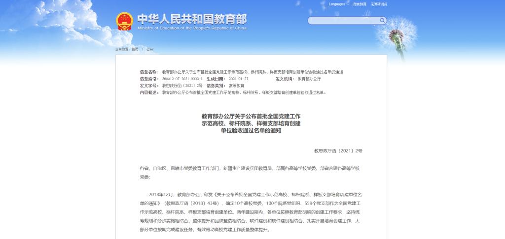 1月26日,教育部办公厅发布了关于公布首批全国党建工作示范高校、标杆院系、样板支部培育创建单位验收通过名单的通知(教思政厅函〔2021〕2号),其中,麻豆影院