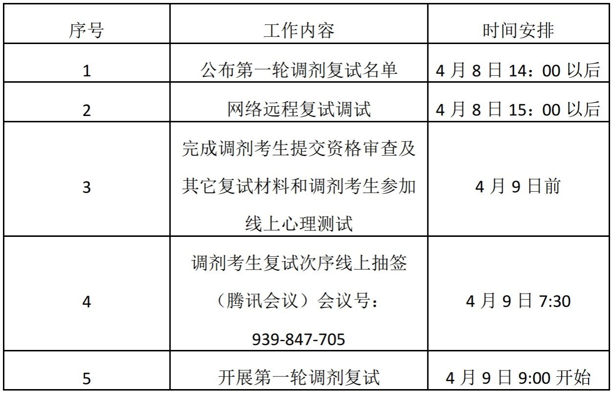 3.复试期间请考生保持手机畅通,网络远程复试调试及复试分组次序抽签,将由工作人员于48日另行电话通知,请考生及时响应并做好线上复试准备。未尽事宜按照上级和学校有关文件执行。
